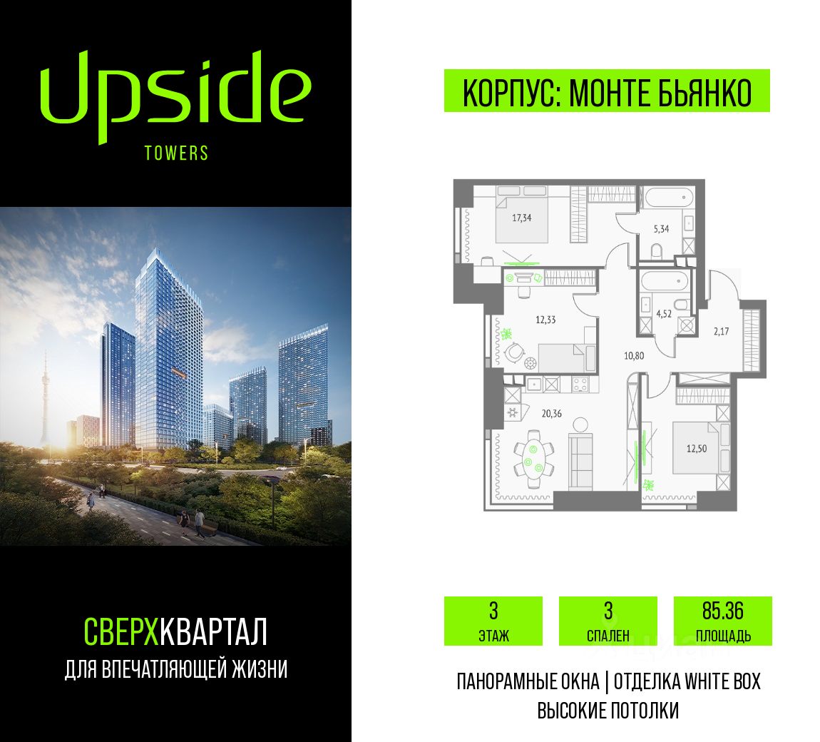 Продаётся 3-комнатная квартира площадью 85.36 кв.м на 3 этаже 46 этажного корпуса Монте Бьянко в квартале небоскребов ''Upside Towers''. В квартире отделка White-box, c видом на Корпус Олимп, корпус Эльбрус, Бизнес-парк Останкино, прогулочный бульвар, детский сад, школу. Номер квартиры Г0313.