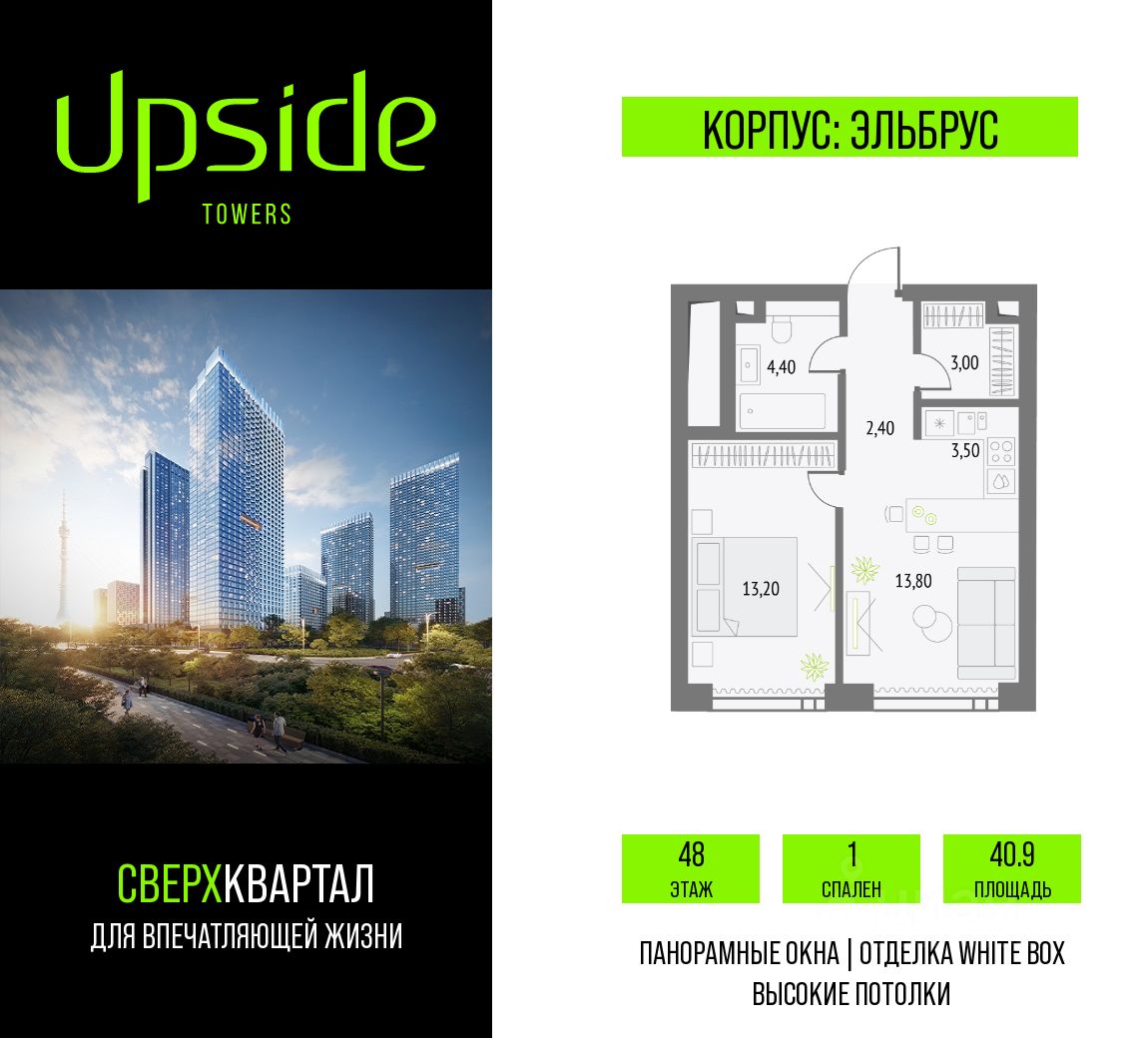 Upside Towers - технологичный квартал строится в динамично развивающемся Бутырском районе, в 3 мин. от метро, в 5 мин. от ТТК. На территории 7 га возводится 5 высотных башен от 19 до 58 этажей, названных в честь главных вершин земли. Квартиры с панорамными окнами в пол, высокими потолками и современными инженерными решениями. Благоустроенная зеленая территория включает: приватные дворы, природный комплекс, прогулочный бульвар, ландшафтный парк 2,5 га с сенсорным садом и многофункциональными игровыми и спортивными площадками.