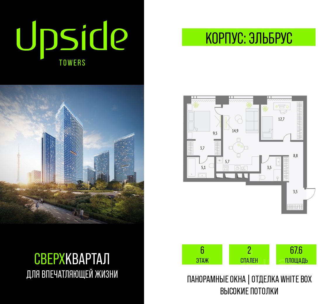 Продаётся 2-комнатная квартира площадью 67.6 кв.м на 6 этаже 55 этажного корпуса Эльбрус в квартале небоскребов ''Upside Towers''. В квартире отделка White-box, c видом на детский сад, БЦ Останкино. Номер квартиры А0605.