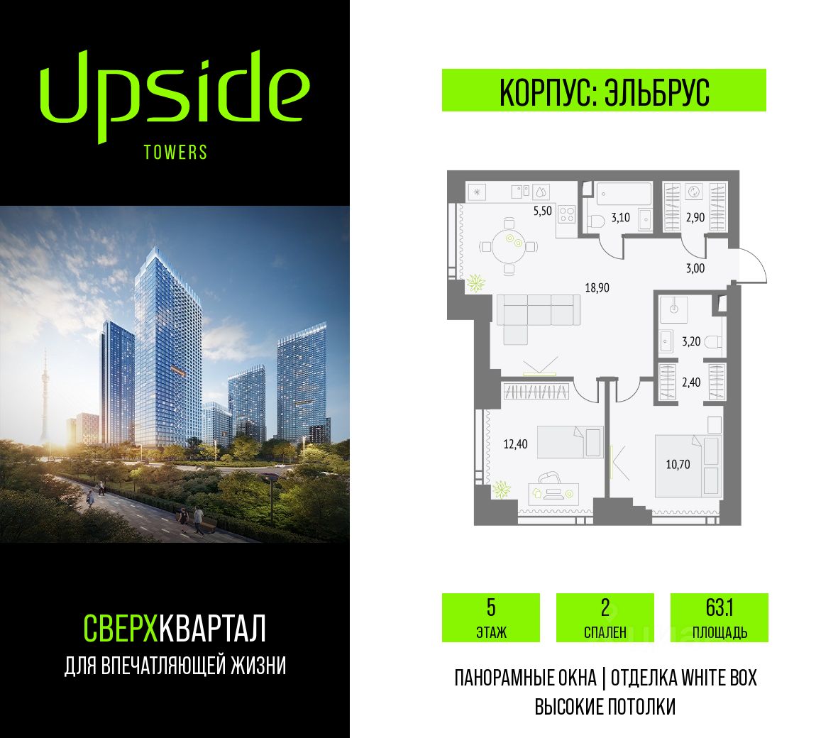Upside Towers - технологичный квартал строится в динамично развивающемся Бутырском районе, в 3 мин. от метро, в 5 мин. от ТТК. На территории 7 га возводится 5 высотных башен от 19 до 58 этажей, названных в честь главных вершин земли. Квартиры с панорамными окнами в пол, высокими потолками и современными инженерными решениями. Благоустроенная зеленая территория включает: приватные дворы, природный комплекс, прогулочный бульвар, ландшафтный парк 2,5 га с сенсорным садом и многофункциональными игровыми и спортивными площадками.