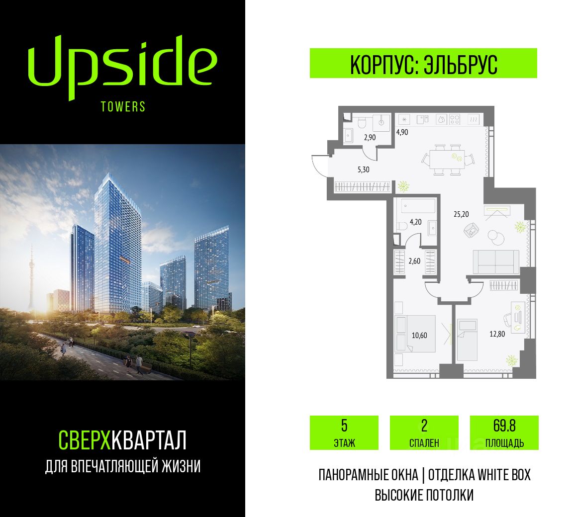 Продаётся 2-комнатная квартира площадью 69.8 кв.м на 5 этаже 55 этажного корпуса Эльбрус в квартале небоскребов ''Upside Towers''. В квартире отделка White-box, c видом на останкинскую башню, внутренний двор, прогулочный бульвар. Номер квартиры А0508.