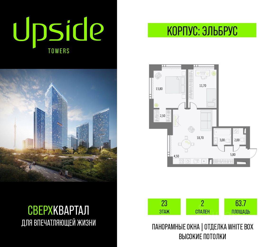 Продаётся 2-комнатная квартира площадью 63.7 кв.м на 23 этаже 55 этажного корпуса Эльбрус в квартале небоскребов ''Upside Towers''. В квартире отделка White-box, c видом на Центр, Москва Сити, Савеловский Сити, БЦ Останкино. Номер квартиры А2301.