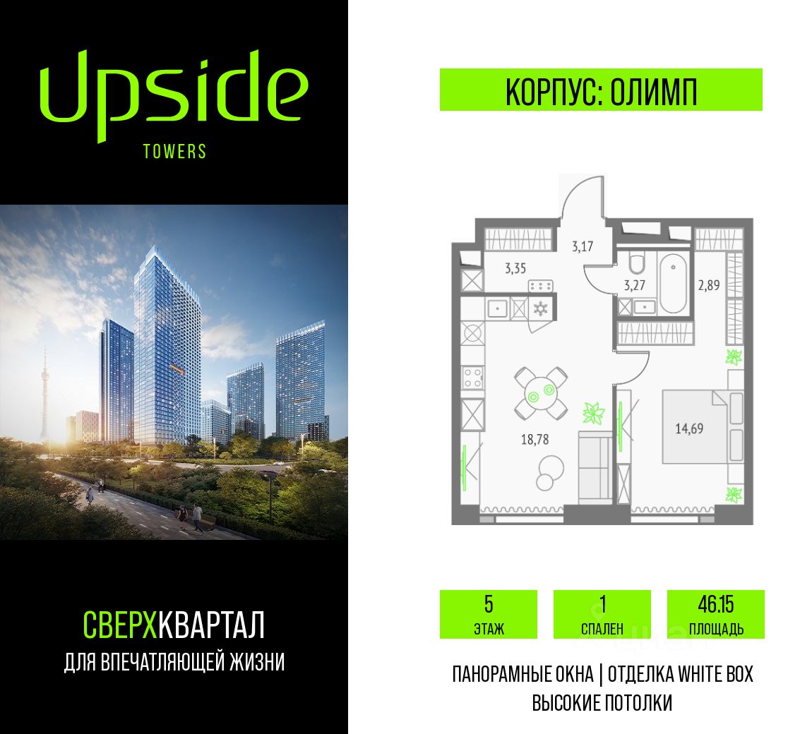 Upside Towers - технологичный квартал строится в динамично развивающемся Бутырском районе, в 3 мин. от метро, в 5 мин. от ТТК. На территории 7 га возводится 5 высотных башен от 19 до 58 этажей, названных в честь главных вершин земли. Квартиры с панорамными окнами в пол, высокими потолками и современными инженерными решениями. Благоустроенная зеленая территория включает: приватные дворы, природный комплекс, прогулочный бульвар, ландшафтный парк 2,5 га с сенсорным садом и многофункциональными игровыми и спортивными площадками.
