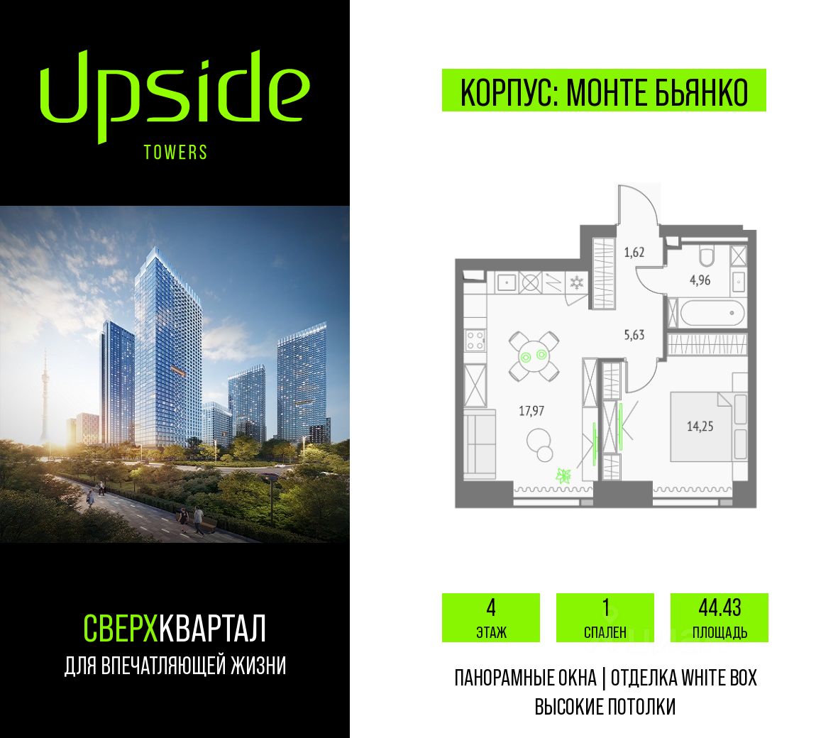 Upside Towers - технологичный квартал строится в динамично развивающемся Бутырском районе, в 3 мин. от метро, в 5 мин. от ТТК. На территории 7 га возводится 5 высотных башен от 19 до 58 этажей, названных в честь главных вершин земли. Квартиры с панорамными окнами в пол, высокими потолками и современными инженерными решениями. Благоустроенная зеленая территория включает: приватные дворы, природный комплекс, прогулочный бульвар, ландшафтный парк 2,5 га с сенсорным садом и многофункциональными игровыми и спортивными площадками.