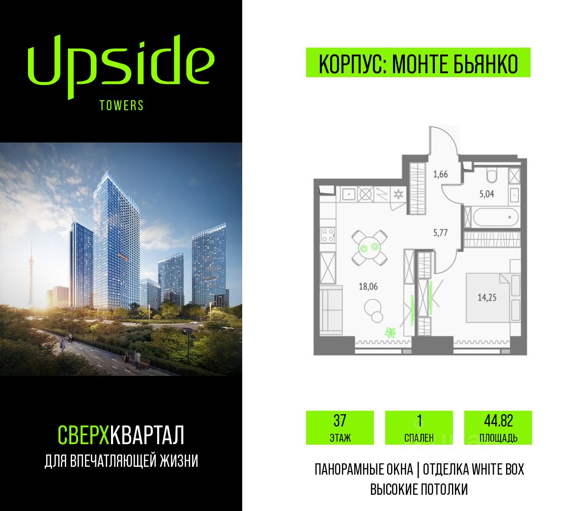 Апсайд Тауэрс - технологичный квартал строится в динамично развивающемся Бутырском районе, в 3 мин. от метро, в 5 мин. от ТТК. На территории 7 га возводится 5 высотных башен от 19 до 58 этажей, названных в честь главных вершин земли. Квартиры с панорамными окнами в пол, высокими потолками и современными инженерными решениями. Благоустроенная зеленая территория включает: приватные дворы, природный комплекс, прогулочный бульвар, ландшафтный парк 2,5 га с сенсорным садом и многофункциональными игровыми и спортивными площадками.