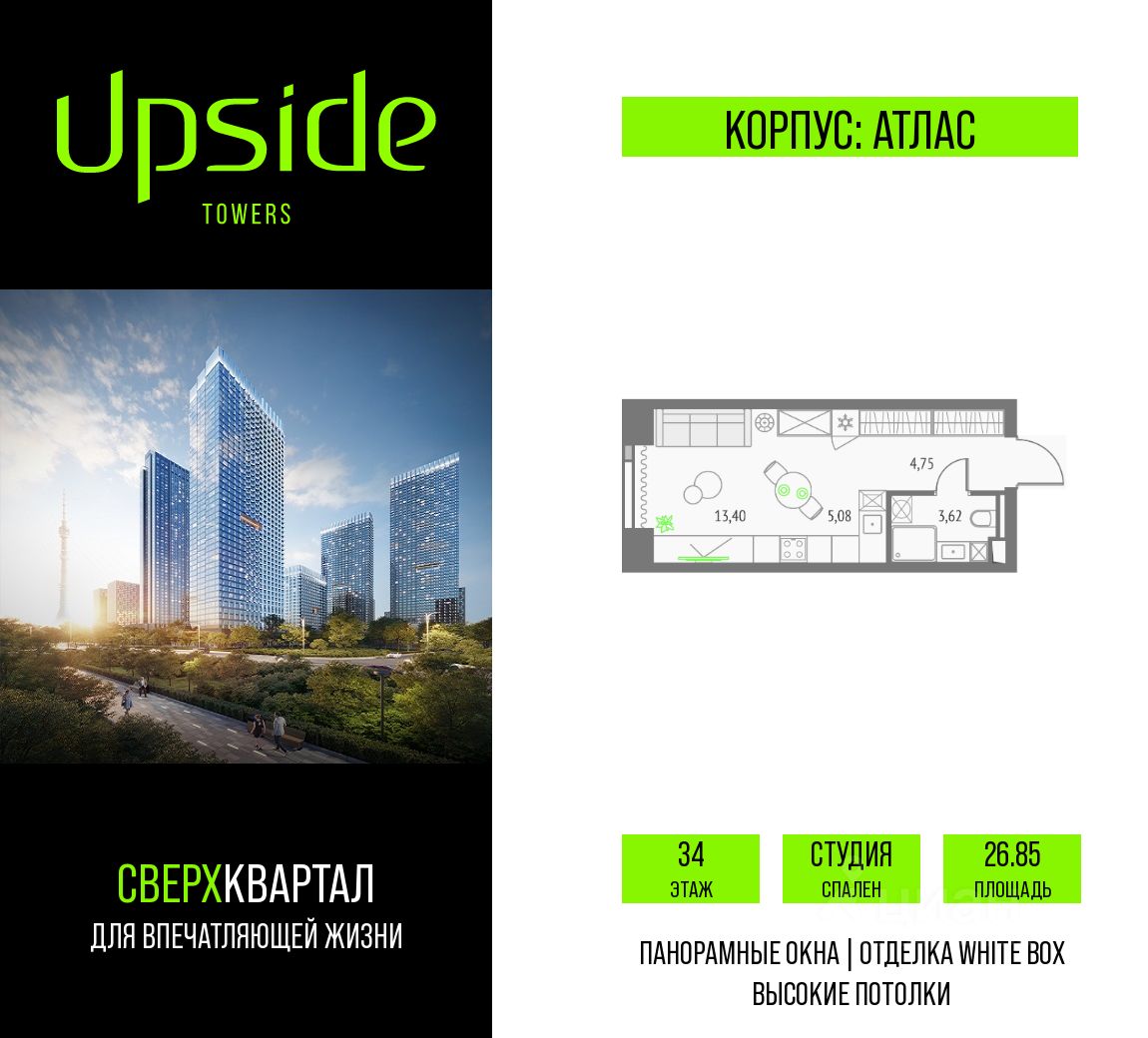 Продаётся студия площадью 26.85 кв.м на 34 этаже 47 этажного корпуса Атлас в квартале небоскребов ''Upside Towers''. В квартире отделка White-box, c видом на Савеловский сити, Гончаровский парк, Москва-Сити, центр. Номер квартиры Б3401.