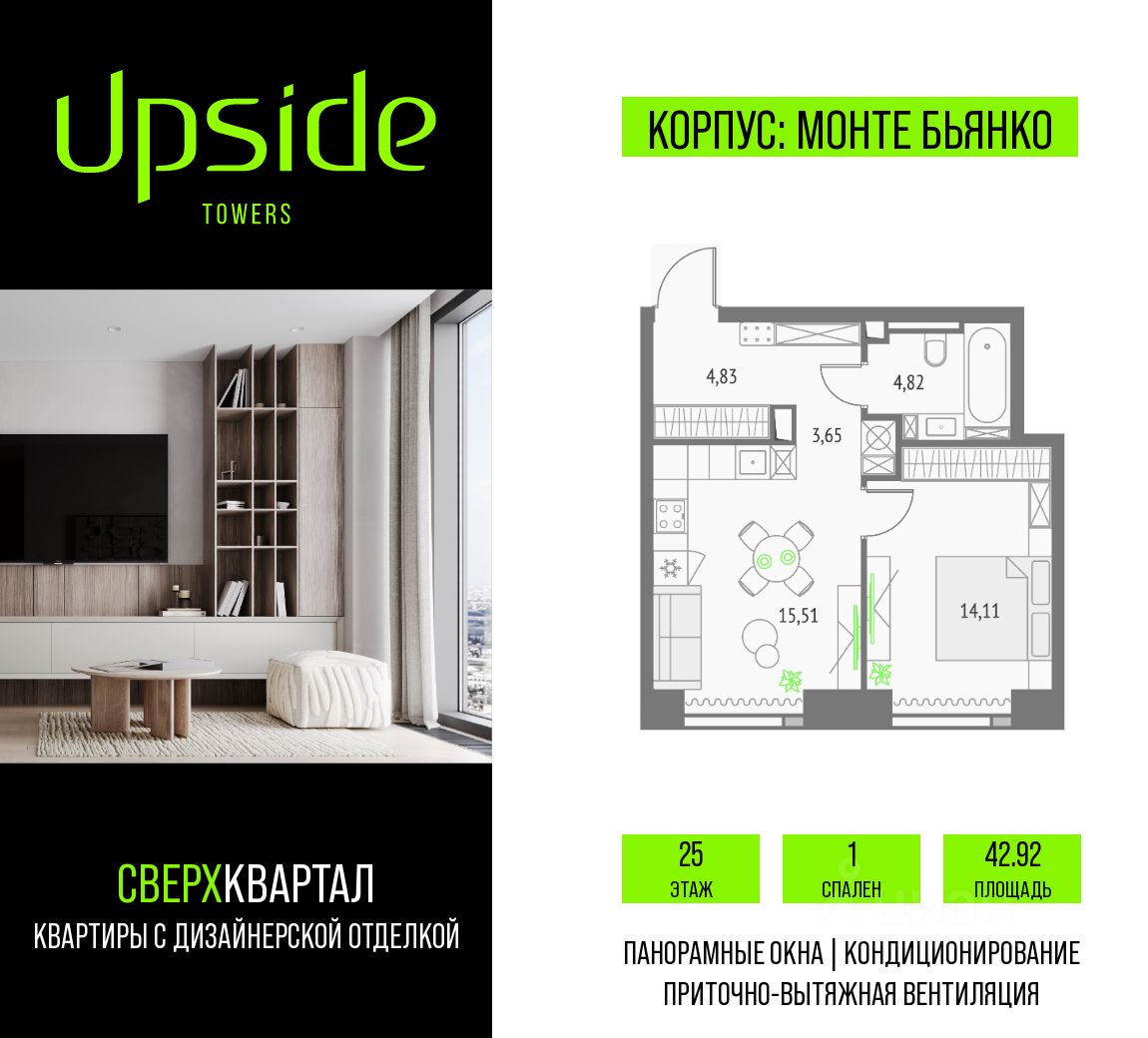 Upside Towers - технологичный квартал строится в динамично развивающемся Бутырском районе, в 3 мин. от метро, в 5 мин. от ТТК. На территории 7 га возводится 5 высотных башен от 19 до 58 этажей, названных в честь главных вершин земли. Квартиры с панорамными окнами в пол, высокими потолками и современными инженерными решениями. Благоустроенная зеленая территория включает: приватные дворы, природный комплекс, прогулочный бульвар, ландшафтный парк 2,5 га с сенсорным садом и многофункциональными игровыми и спортивными площадками.