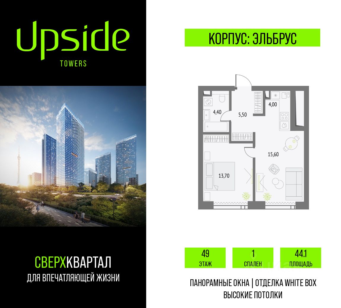 Upside Towers - технологичный квартал строится в динамично развивающемся Бутырском районе, в 3 мин. от метро, в 5 мин. от ТТК. На территории 7 га возводится 5 высотных башен от 19 до 58 этажей, названных в честь главных вершин земли. Квартиры с панорамными окнами в пол, высокими потолками и современными инженерными решениями. Благоустроенная зеленая территория включает: приватные дворы, природный комплекс, прогулочный бульвар, ландшафтный парк 2,5 га с сенсорным садом и многофункциональными игровыми и спортивными площадками.