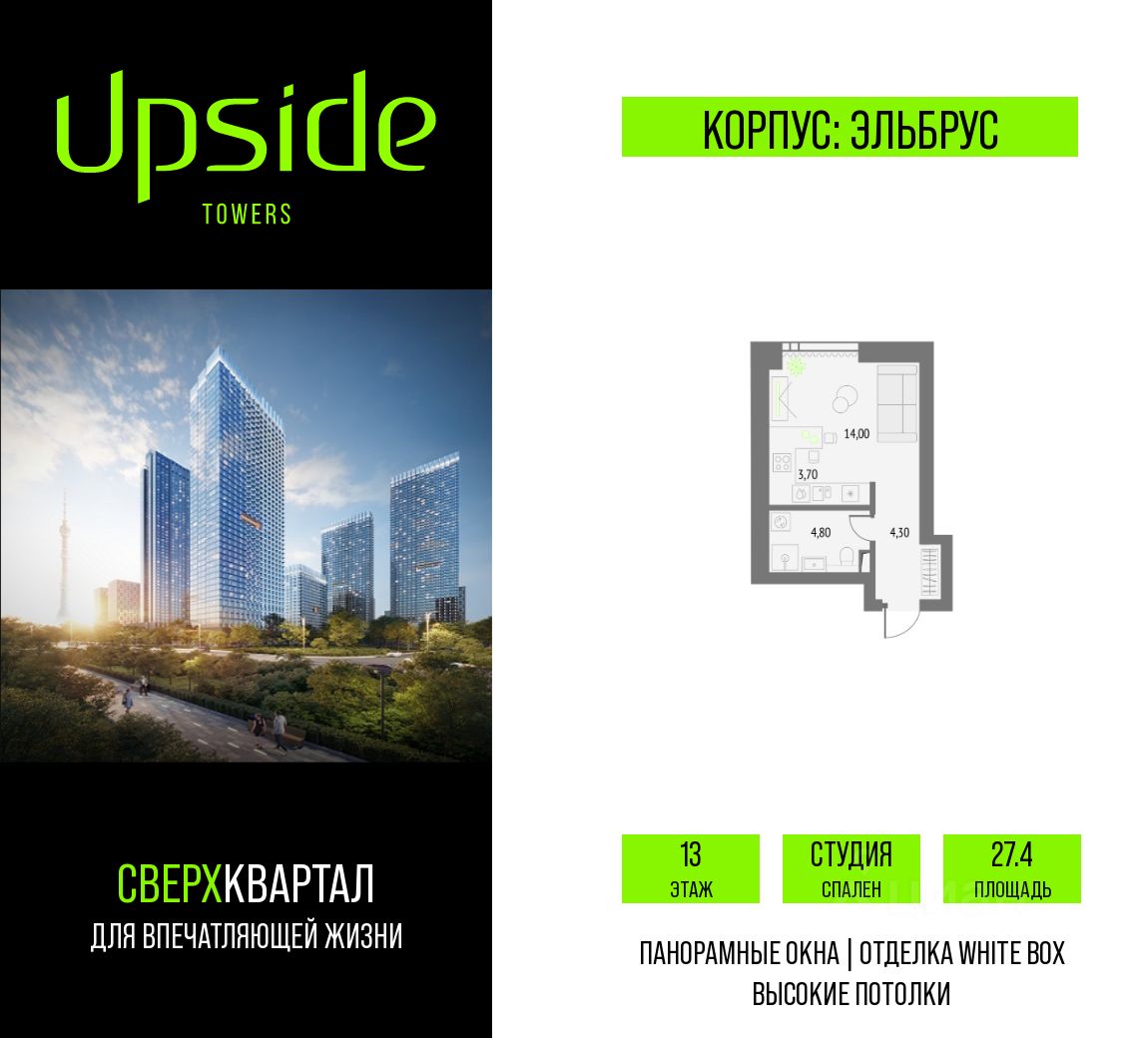 Upside Towers - технологичный квартал строится в динамично развивающемся Бутырском районе, в 3 мин. от метро, в 5 мин. от ТТК. На территории 7 га возводится 5 высотных башен от 19 до 58 этажей, названных в честь главных вершин земли. Квартиры с панорамными окнами в пол, высокими потолками и современными инженерными решениями. Благоустроенная зеленая территория включает: приватные дворы, природный комплекс, прогулочный бульвар, ландшафтный парк 2,5 га с сенсорным садом и многофункциональными игровыми и спортивными площадками.