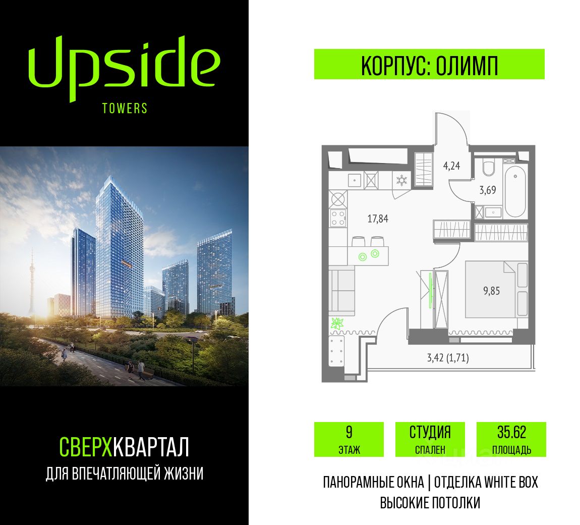 Продаётся студия площадью 35.62 кв.м на 9 этаже 19 этажного корпуса Олимп в квартале небоскребов ''Upside Towers''. В квартире отделка White-box, c видом на внутренний двор, ландшафтный парк. Номер квартиры В0910.