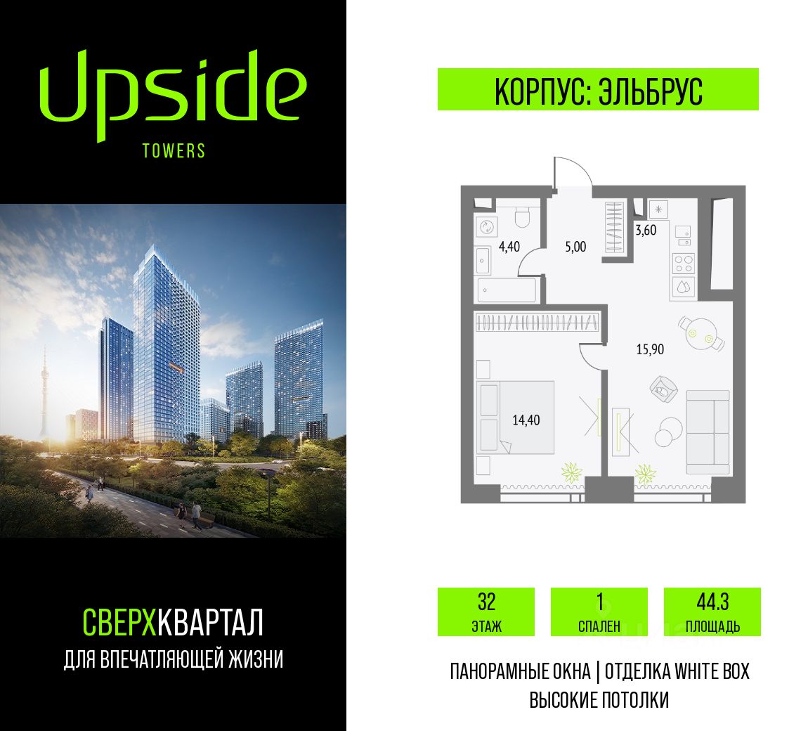 Продаётся 1-комнатная квартира площадью 44.3 кв.м на 32 этаже 55 этажного корпуса Эльбрус в квартале небоскребов ''Upside Towers''. В квартире отделка White-box, c видом на 2 очередь, прогулочный бульвар, парк Сокольники. Номер квартиры А3211.