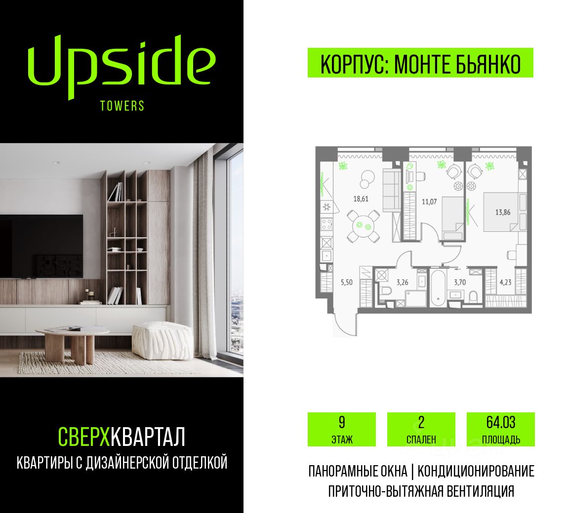 Продаётся 2-комнатная квартира площадью 64.03 кв.м на 9 этаже 46 этажного корпуса Монте Бьянко в квартале небоскребов ''Upside Towers''. Квартира с чистовой отделкой, c видом на Звездный бульвар, Ольгинский храм, Останкинскую Башню. Номер квартиры Г0903.