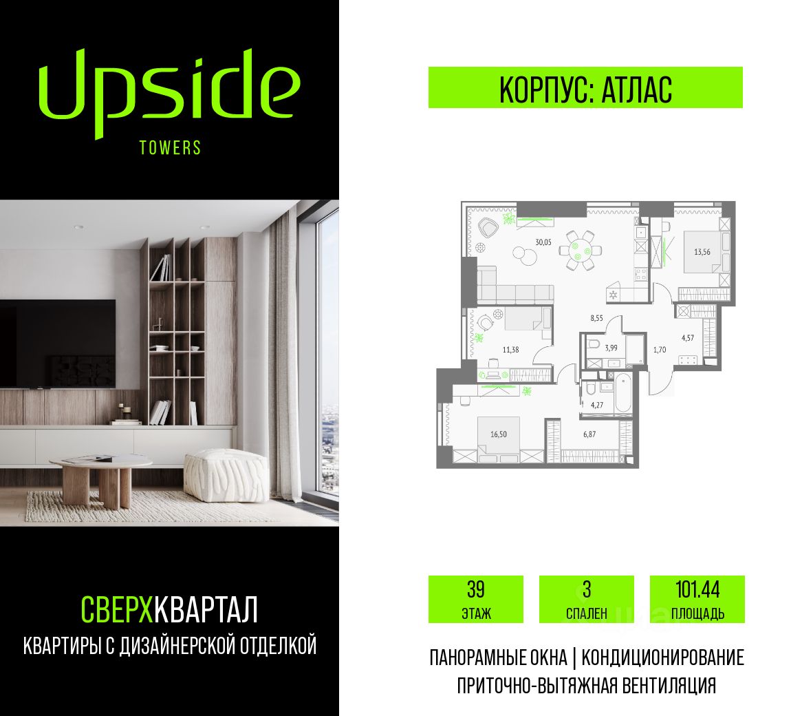 Продаётся 3-комнатная квартира площадью 101.44 кв.м на 39 этаже 47 этажного корпуса Атлас в квартале небоскребов ''Апсайд Тауэрс'', квартира с чистовой отделкой, c видом на Савеловский сити, Гончаровский парк, Москва-Сити, центр, корпус Эльбрус, прогулочный бульвар. Номер квартиры Б3901.