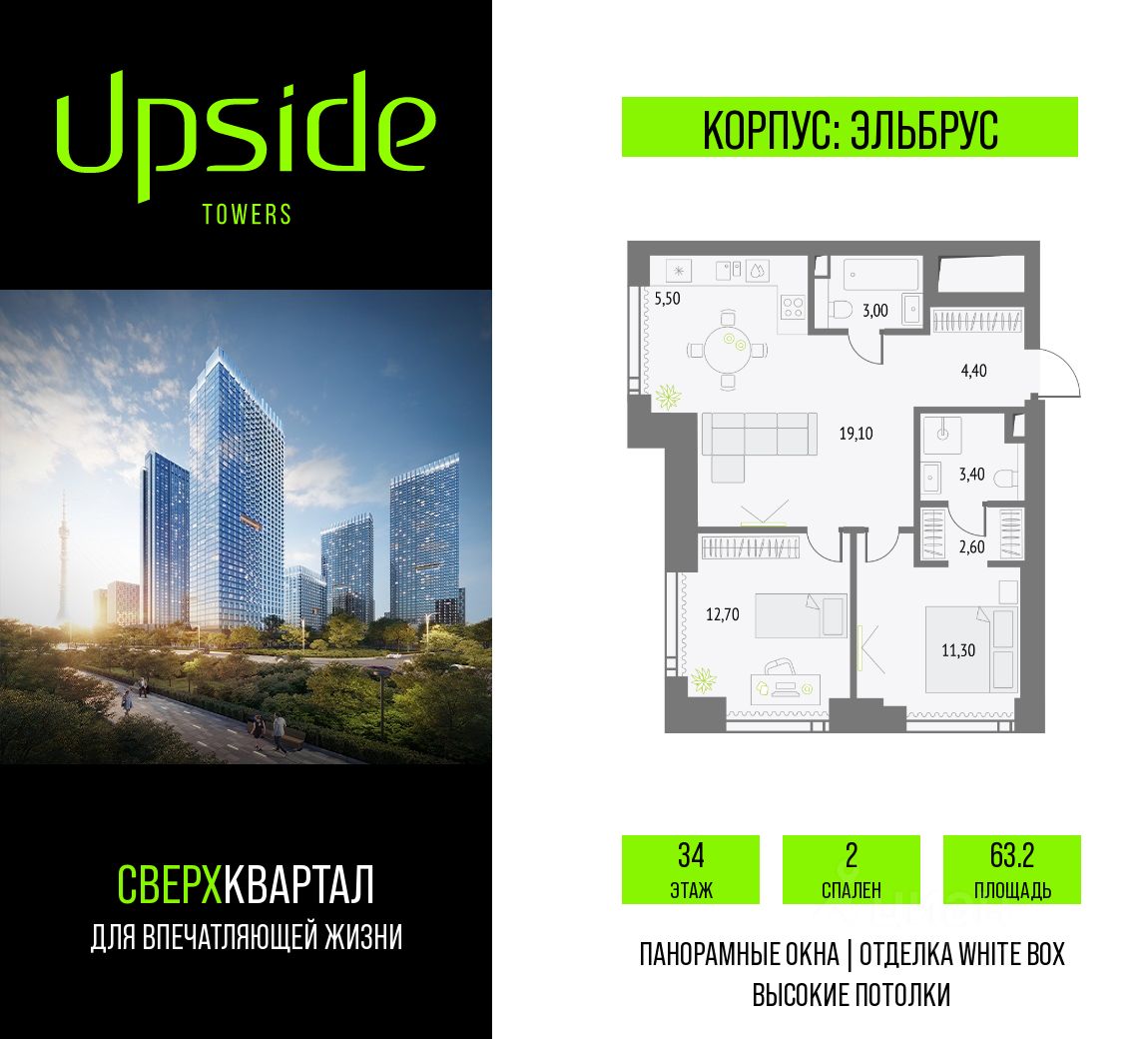 Продаётся 2-комнатная квартира площадью 63.2 кв.м на 34 этаже 55 этажного корпуса Эльбрус в квартале небоскребов ''Upside Towers''. В квартире отделка White-box, c видом на прогулочный бульвар, 2 очередь, центр, Москва Сити, Савеловский Сити. Номер квартиры А3415.