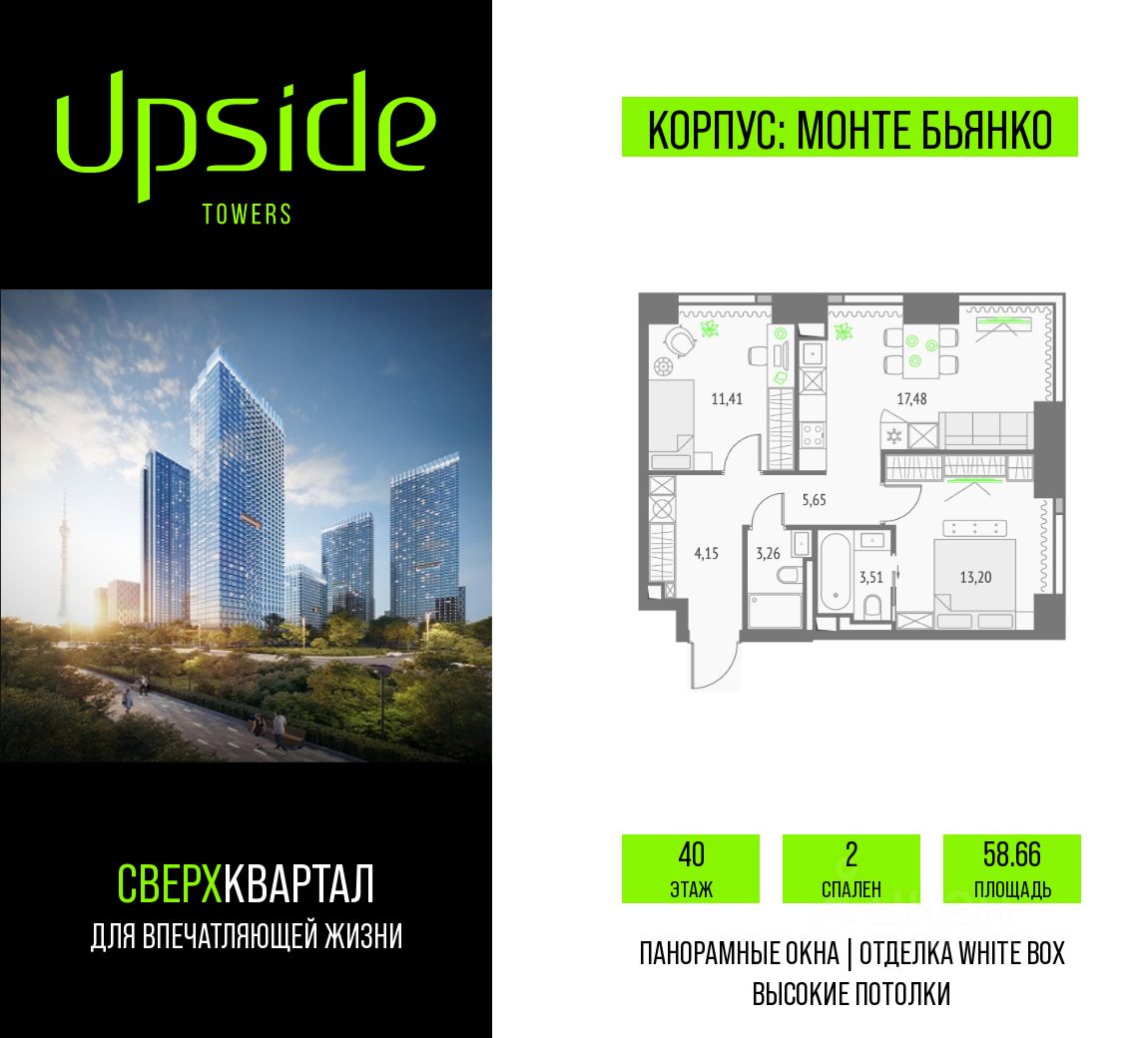 Продаётся 2-комнатная квартира площадью 58.66 кв.м на 40 этаже 46 этажного корпуса Монте Бьянко в квартале небоскребов ''Upside Towers''. В квартире отделка White-box, c видом на Звездный бульвар, Останкинскую Башню, ВДНХ, корпус Эверест, Ландшафтный парк. Номер квартиры Г4005.
