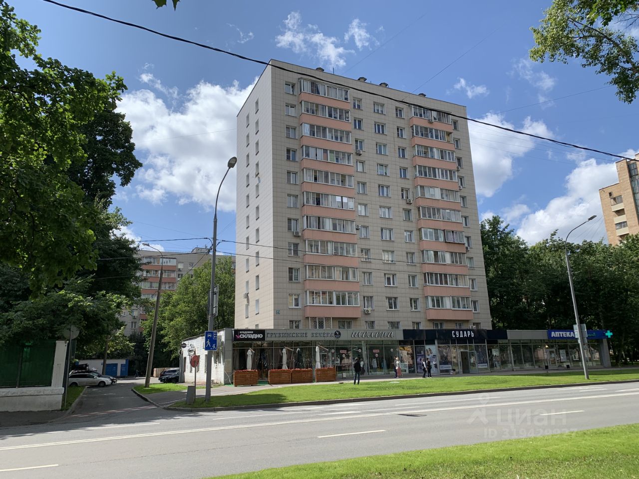 Во дворе детская площадка, рядом с домом несколько продуктовых магазинов.