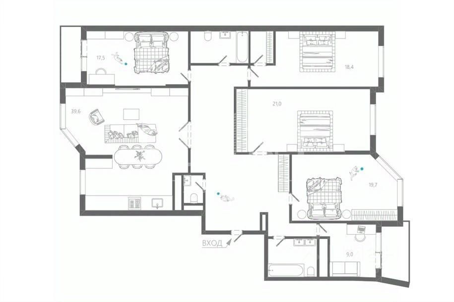 Планировка: кухня-гостиная, три спальни, одна из которых со своей гардеробной, кабинет, два совмещенных санузла, гостевой санузел, прихожая.