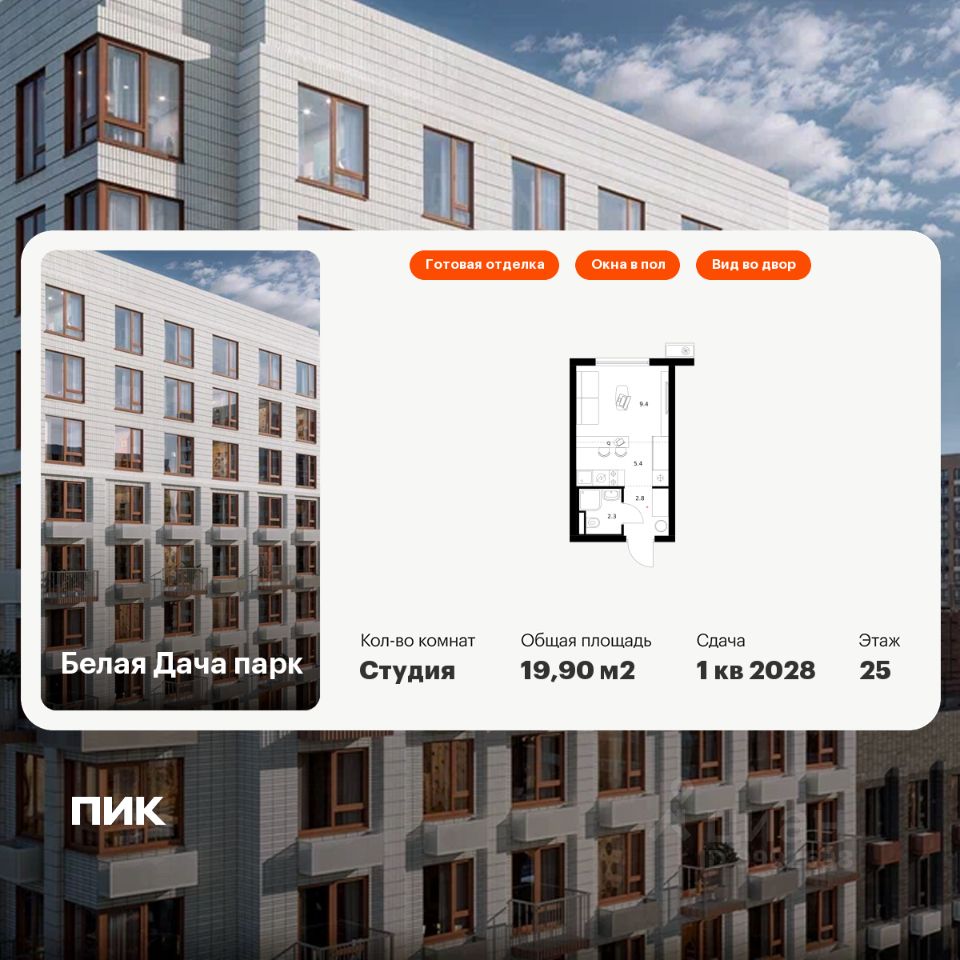 Продаётся квартира-студия площадью 19,9 кв.м на 25 этаже 25 этажного дома (Корпус 16.2, Секция 5) проекта ПИК Белая Дача парк. Светлый просторный подъезд на уровне земли, функциональная планировка, большие окна, c отделкой.