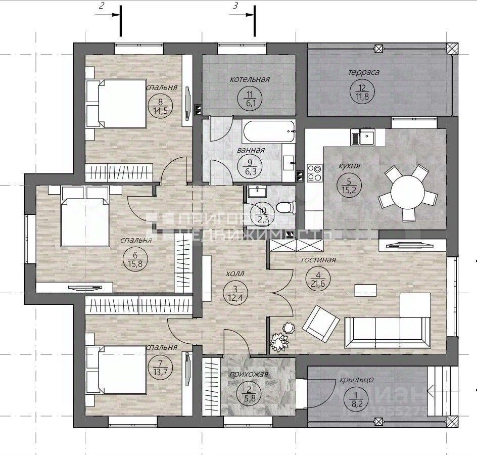 3 большие спальни Светлая гостиная Кухня с выходом на террасу