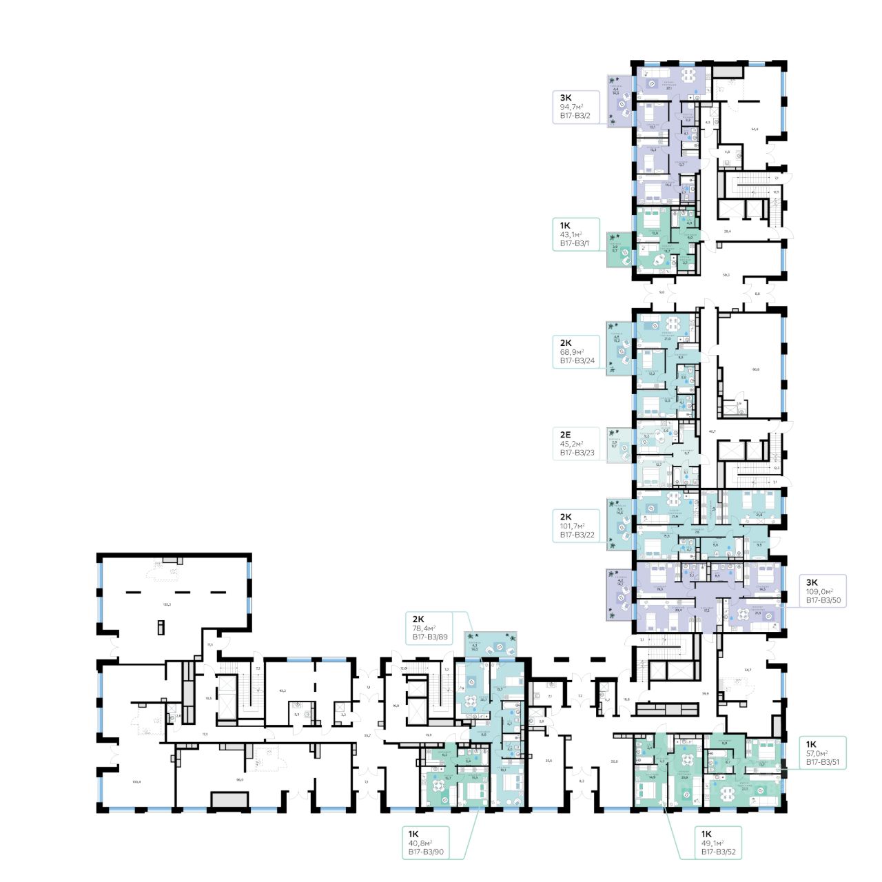 Квартал В17 состоит из шести корпусов переменной этажности (от 1 до 10 этажей) и 491 квартиры. Корпуса объединены общей подземной частью, где расположен паркинг на 309 автомобилей, места для мотоциклов и более 400 кладовых помещений. На первом этаже дома — уютное лобби, лапомойка, колясочная и велосипедная комната.