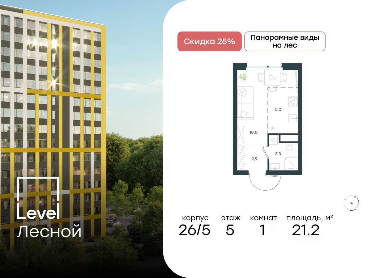 В районе, утопающем в густой зелени лесов, многочисленных парков и скверов, продаётся студия площадью 21.20 кв.м с отделкой white box. Квартира расположена на 5 этаже в жилом комплексе комфорт-класса Level Лесной (компания Level Group/Левел групп).