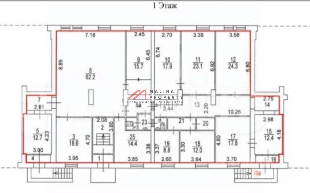 Помещение 304,5 м2, располагается на 1 этаже, кабинетная планировка, два отдельных входа с фасада, высота потолка 3,2 м, витринные окна по фасаду. Электрическая мощность 20 кВт. Место для размещения рекламы.