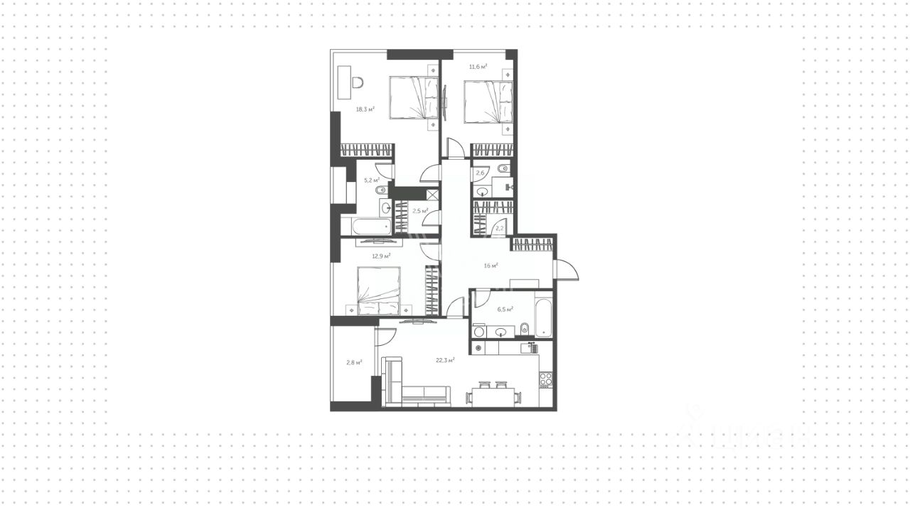 Продуманная площадь позволяет воплотить гармоничное зонирование: * кухня-гостиная с выходом на лоджию — место для семейных ужинов и уютных вечеров с видом на реку * мастер-спальня с личной ванной комнатой и гардеробной — приватная зона спокойствия и уюта * две спальни для детей, гостей или рабочего кабинета * санузел и отдельная постирочная для максимального комфорта * просторный холл и дополнительные гардеробные