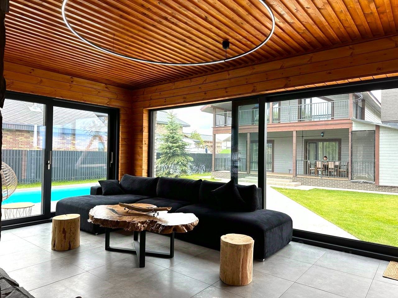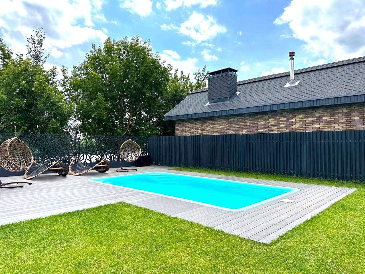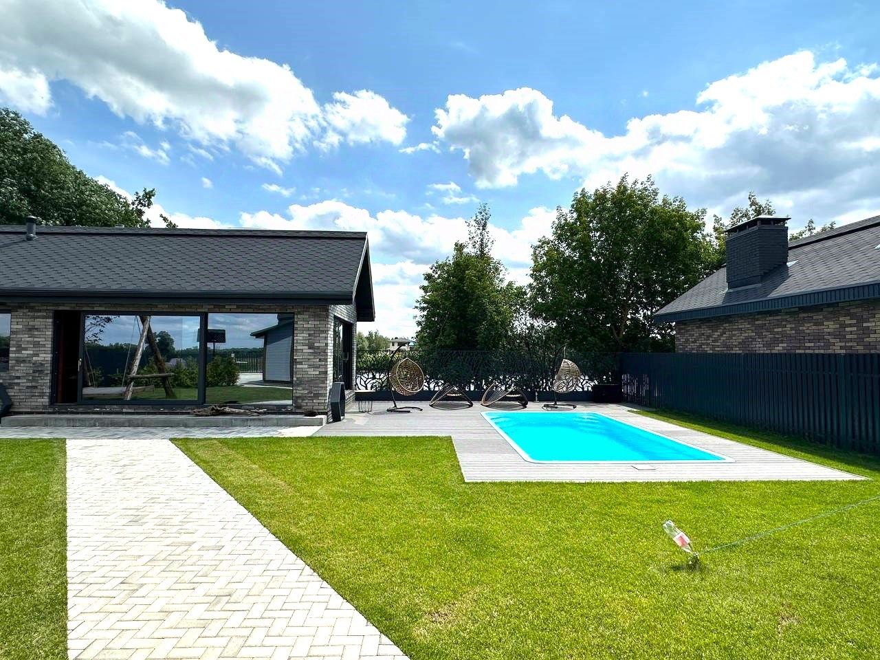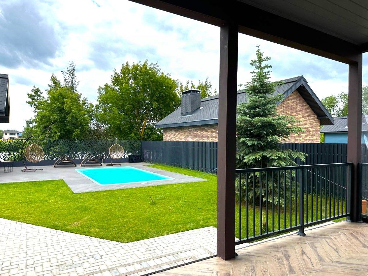 Бассейн подогревом и релакс-зоной и баня на участке - отдельный предмет гордости - наполнят удовольствием жизнь будущих хозяев.