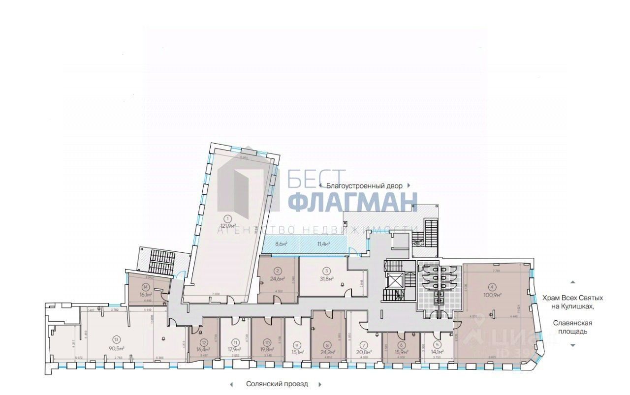Отдельный вход со стороны благоустроенного двора. В наличии есть лоты с террасой. Виды из помещений на: Храм Всех Святых на Кулишках, Солянский проезд, Славянскую площадь.