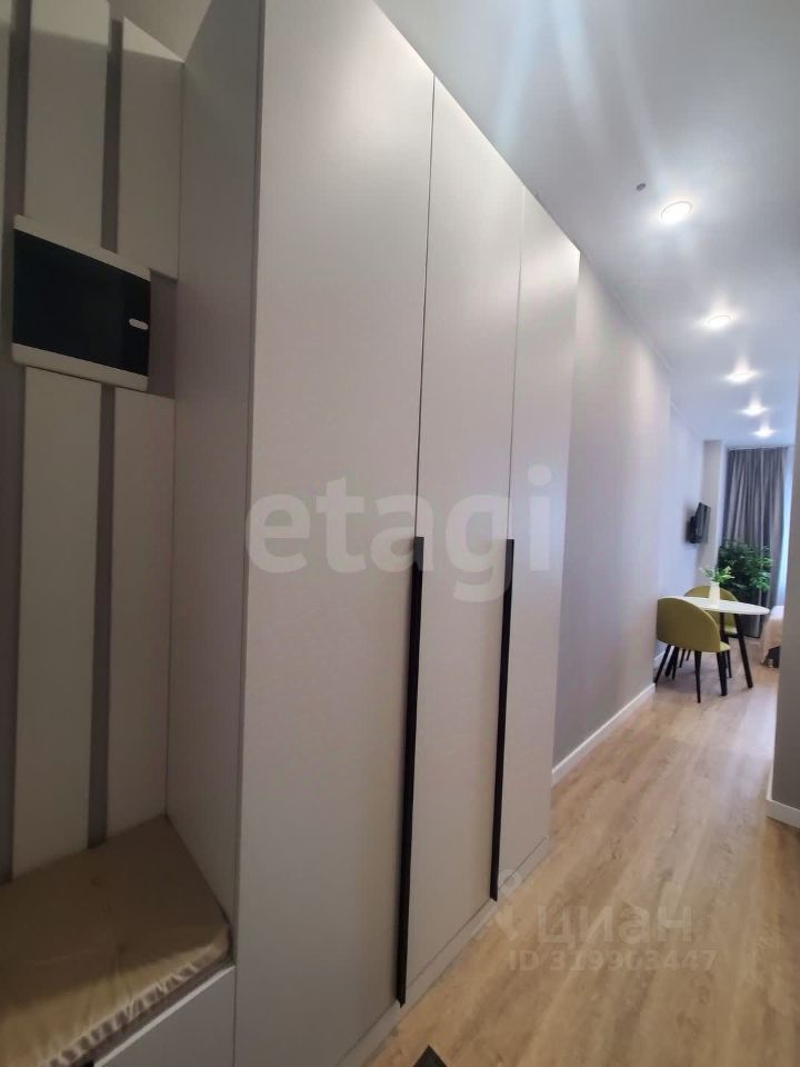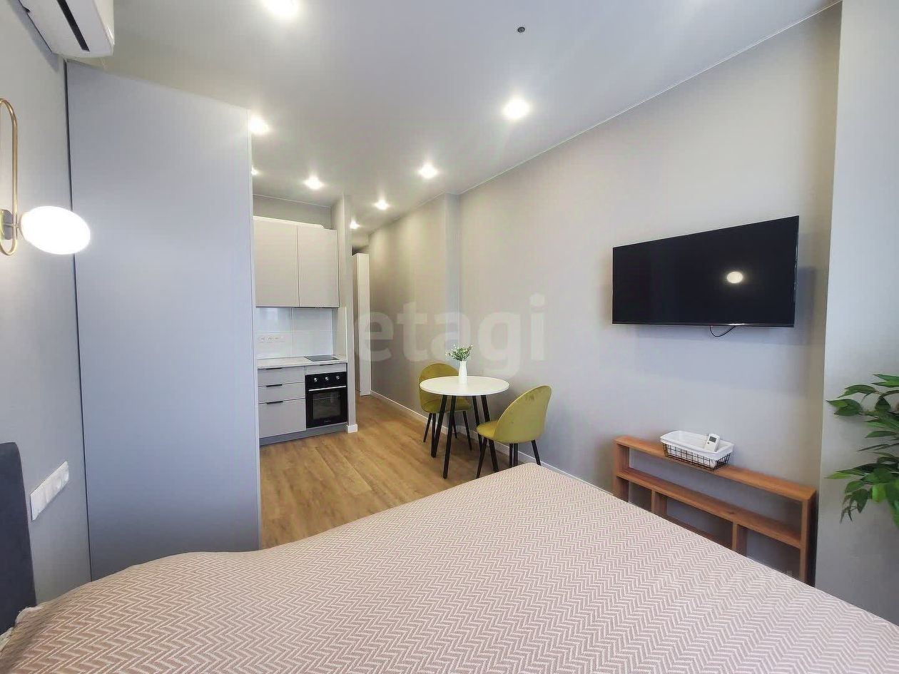 Уютная студия на 6 этаже апарт-комплекса. В студии сделан качественный дизайнерский ремонт, установлены вместительные шкафы, изготовленгые по индивидуальному проекту. Студия полностью укомплектована всей необходимой мебелью и техникой.
