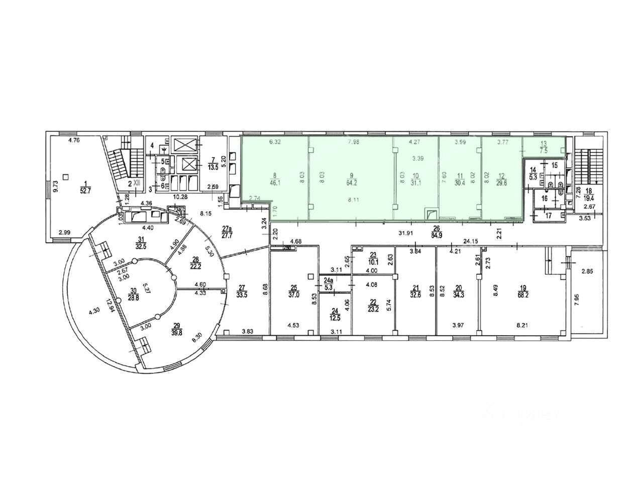 Характеристики: - Класс: B+, - Арендопригодная площадь: 6517, - Код налоговой: 15, - Размер типового этажа: 1095, - Высота потолков: 3.6 м, 4.05 м, - Наличие лифта: Есть, - Кол-во мест подземного паркинга: 80.