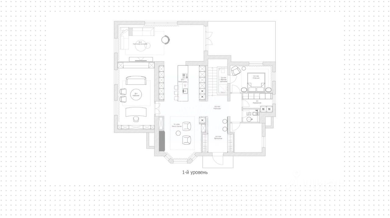 Поэтажное описание 1-й уровень: прихожая, холл, гостевая спальня с санузлом, постирочная, санузел, котельная, каминный зал, кухня-столовая-гостиная, кабинет, терраса.