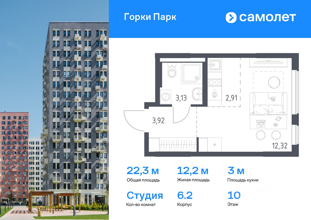 Предлагается квартира студия комфорт-класса 22,28 кв.м в корпусе 6.2 на 10 этаже, в ЖК ''Горки Парк'' Квартира без отделки. Доступность опции ''отделка'' и возможность комплектации мебелью и декором уточняйте у застройщика.