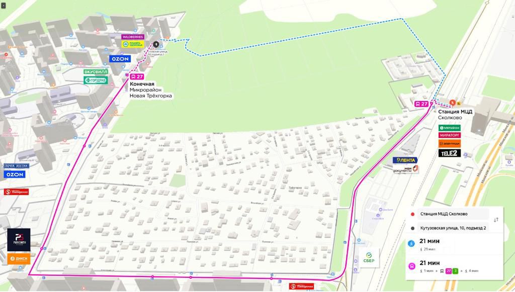 Станция МЦД ''Сколково'' ~20 минут на маршрутке или пешком. Эко-тропа к станции проходит через Подушкинский лесопарк и начинается сразу от дома. (см. схему)