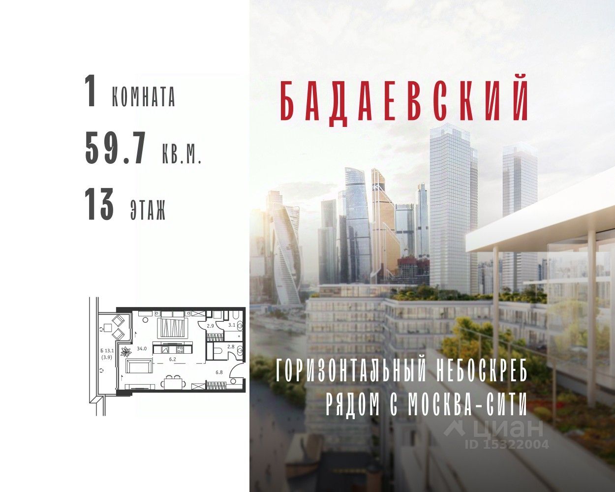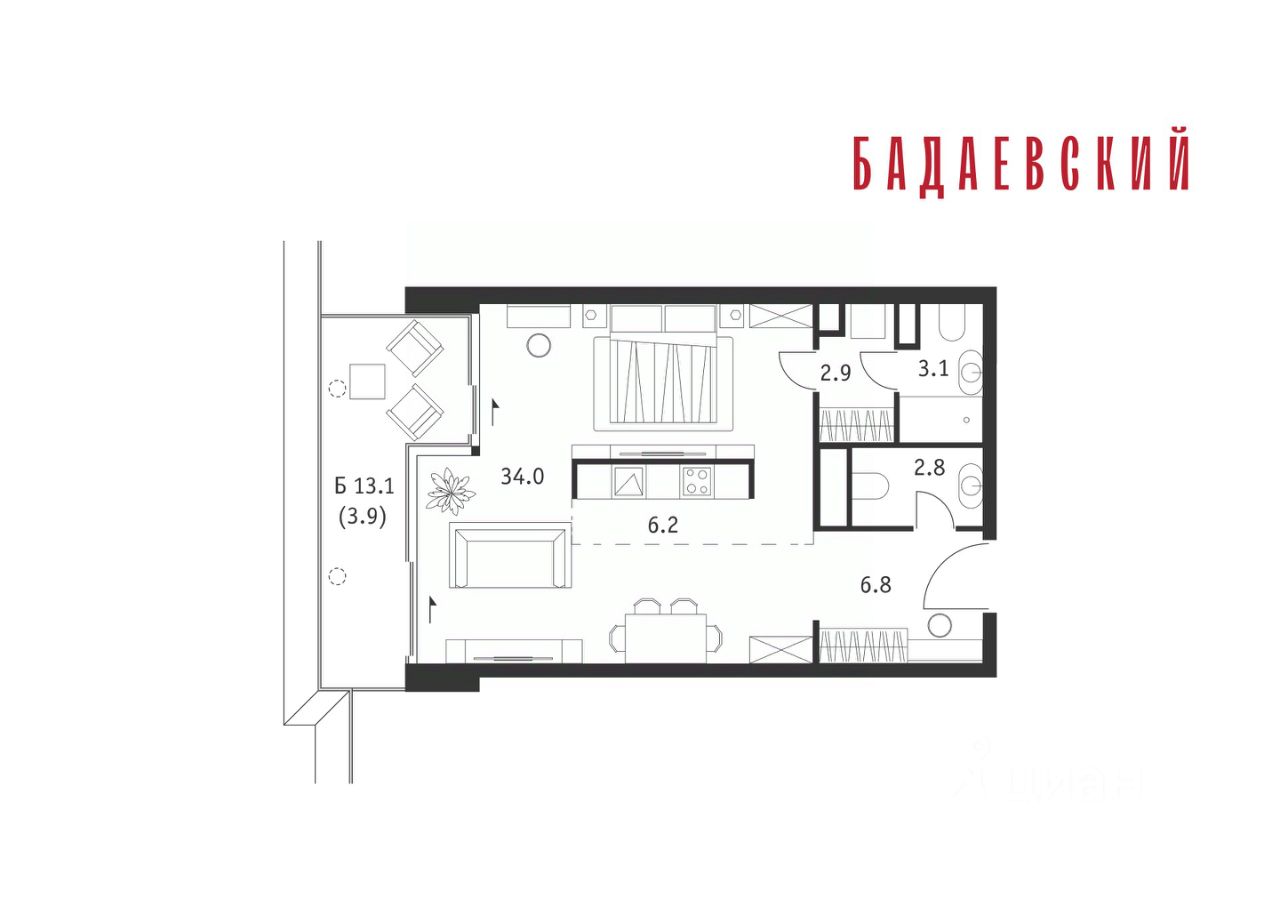 Продаётся 1-комнатная квартира общей площадью 59.70 м² на 13 этаже Жилого Комплекса Бадаевский.