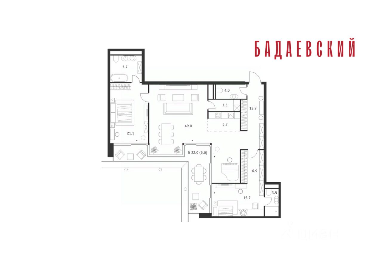 Продаётся 3-комнатная квартира общей площадью 136.40 м² на 12 этаже Жилого Комплекса Бадаевский.