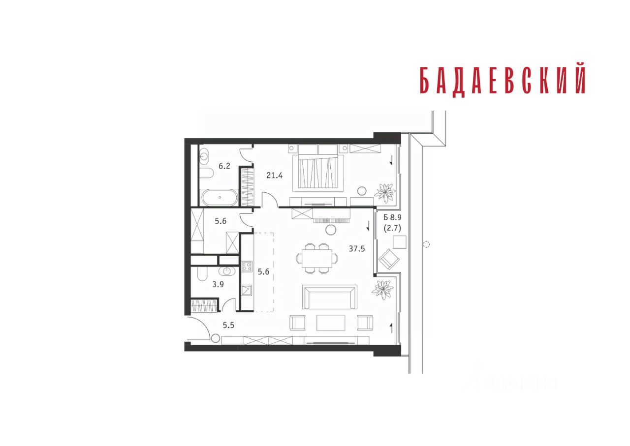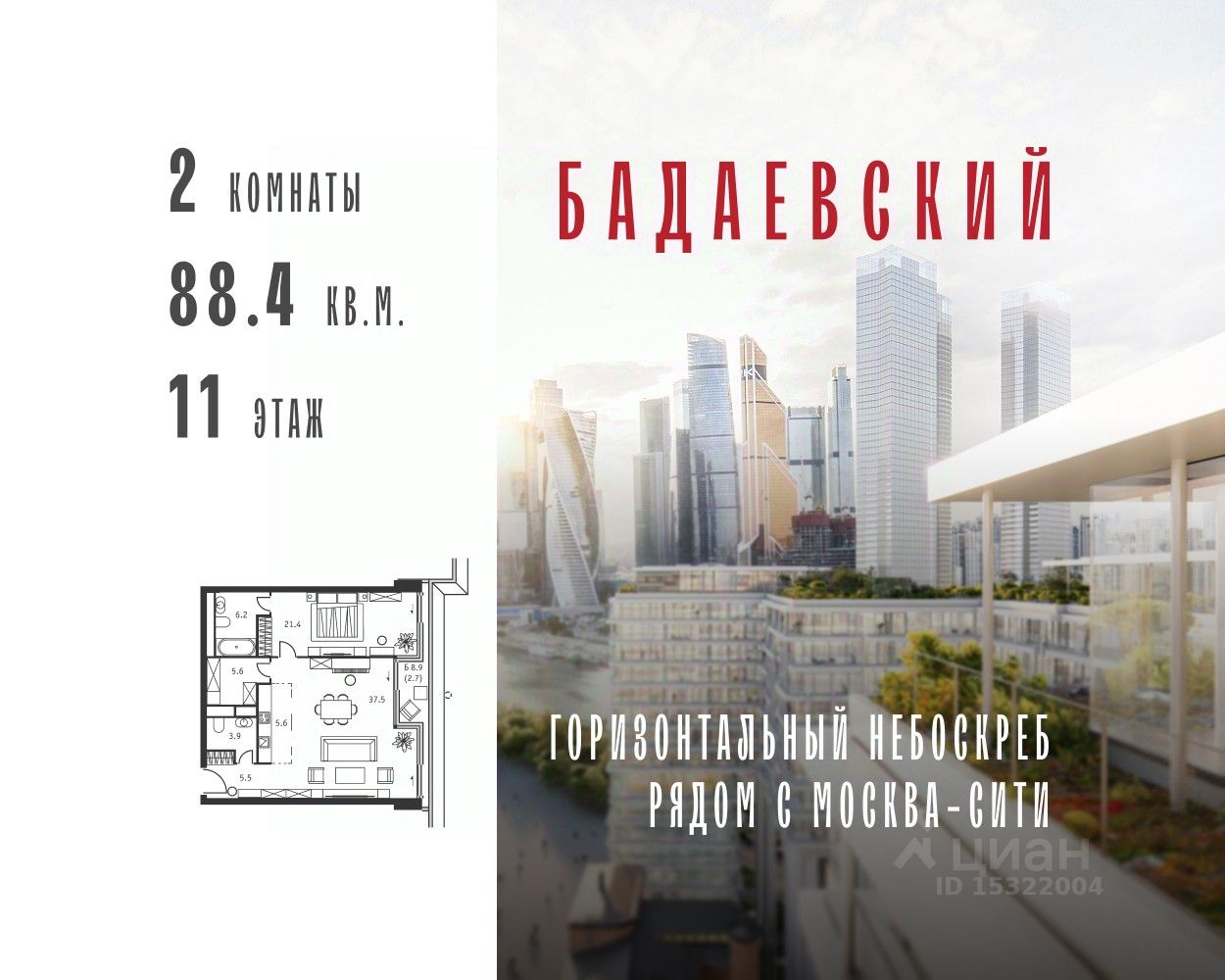 Продаётся 2-комнатная квартира общей площадью 88.40 м² на 11 этаже Жилого Комплекса Бадаевский.