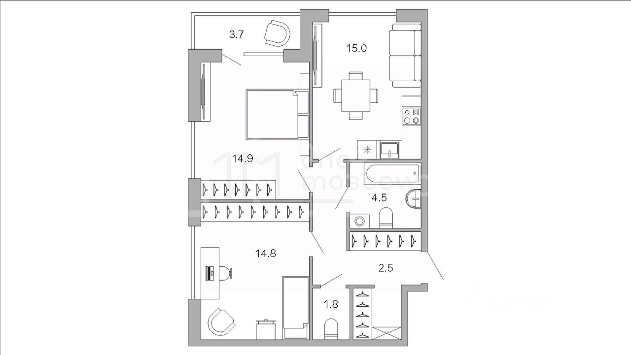 — Общая площадь 64.4 кв.м на 7-м этаже — Угловая планировка повышенной комфортности — Кухня-гостиная и 2 спальни — Потолки 3.15 м и окна увеличенной высоты — Лоджия, которая выходит на тихие улицы