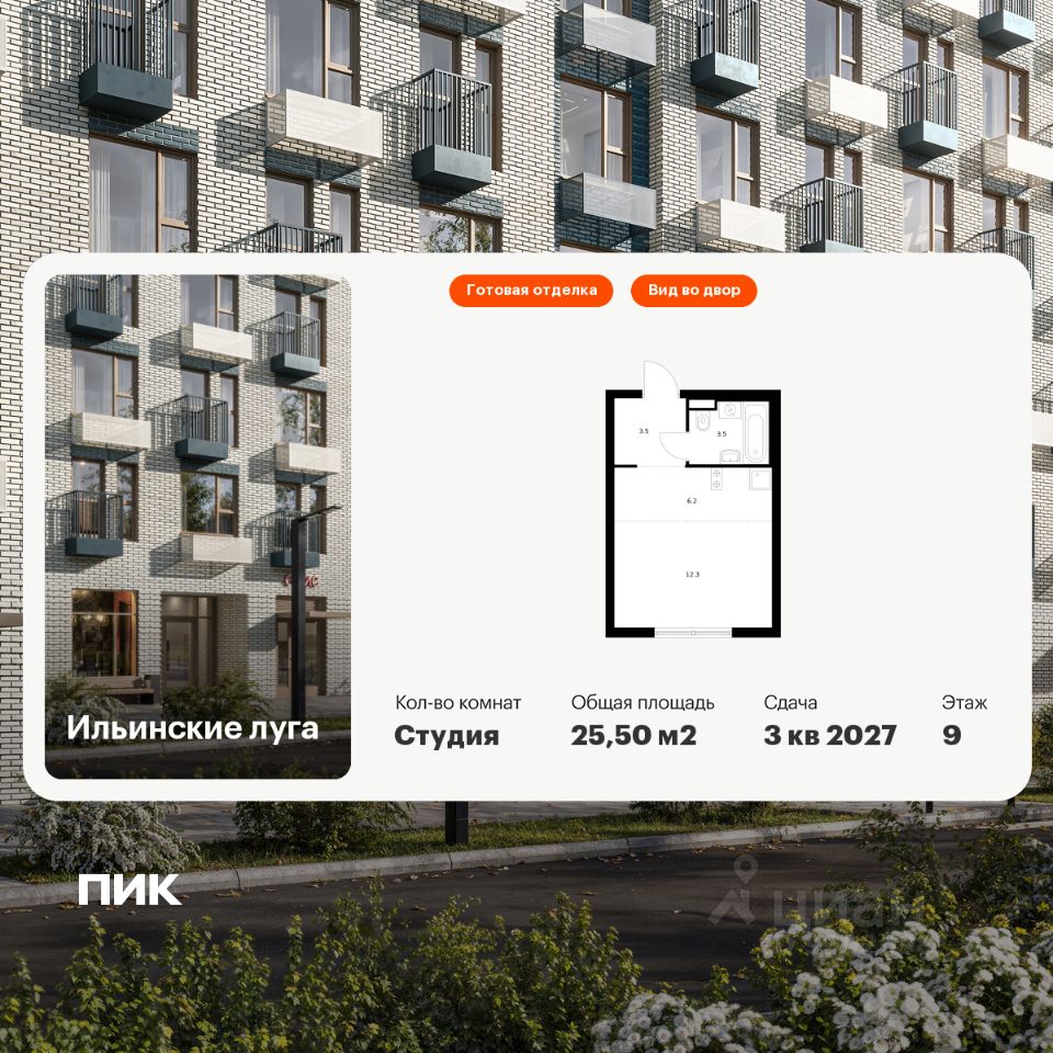 Продаётся квартира-студия площадью 25,5 кв.м на 9 этаже 9 этажного дома (Корпус 3.3, Секция 3) проекта ПИК Ильинские луга. Светлый просторный подъезд на уровне земли, функциональная планировка, большие окна, c отделкой.