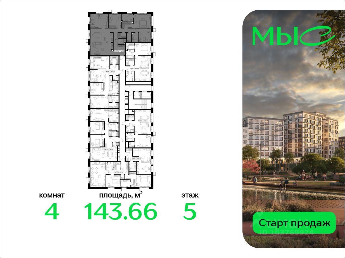 В продаже квартира площадью 143.66 кв. м без отделки на 5 этаже 10 этажного дома. Квартира находится в премиальном жилом комплексе ''МЫС'' (Застройщик - MR Group).