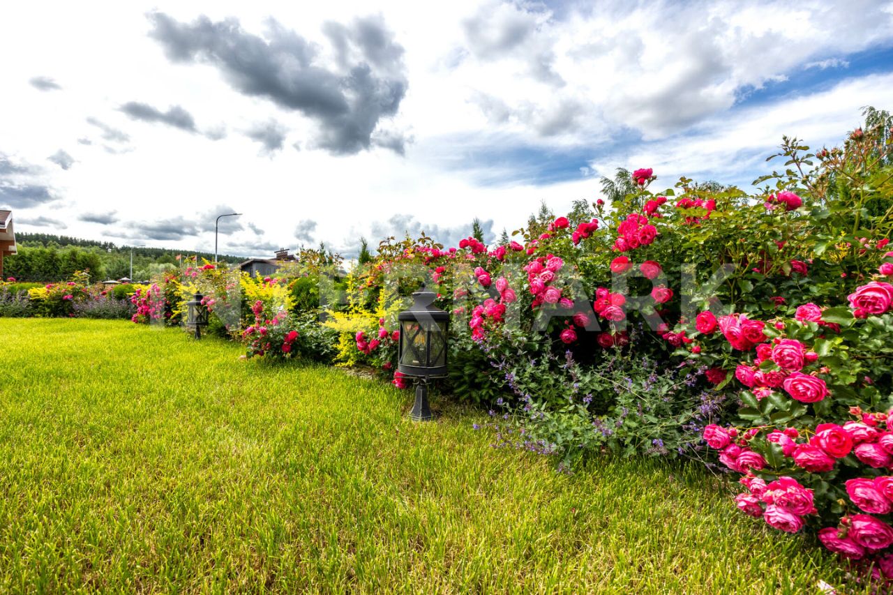 Коттедж стоит на участке площадью 10.5 соток с зеленым газоном и красивым ландшафтным дизайном. На территории имеется хозяйственная постройка для хранения дачных принадлежностей и инструментов.