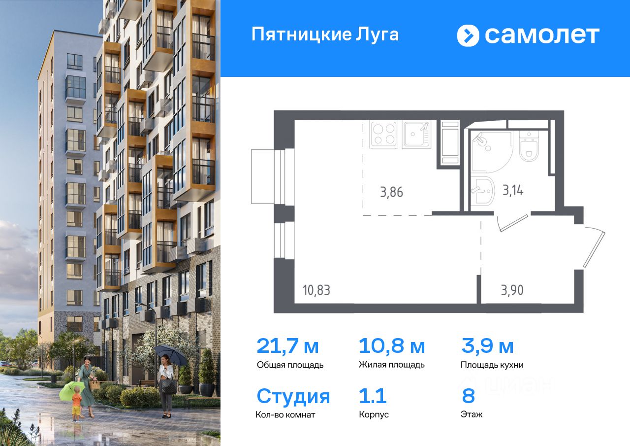 Предлагается квартира студия комфорт-класса 21,7 кв.м в корпусе 1.1 на 8 этаже, в ЖК ''Пятницкие Луга'' Квартира без отделки. Доступность опции ''отделка'' и возможность комплектации мебелью и декором уточняйте у застройщика.