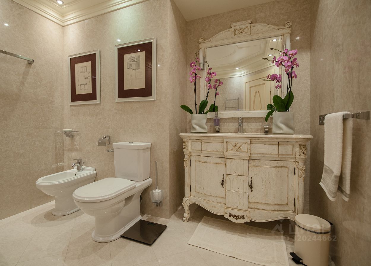 В квартире просторная кухня-гостиная со столовой зоной, три спальни и три санузла. Выполнен дизайнерский ремонт в стиле современной классики. В отделке использованы натуральный камень, ценные породы дерева, мрамор Crema Marfil, наборный паркет выбеленный дуб.