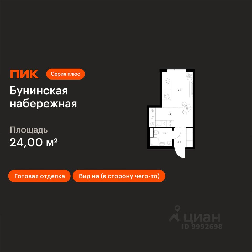 Продаётся квартира-студия площадью 24 кв.м на 2 этаже 16 этажного дома (Корпус 2.6/1.4, Секция 4) проекта ПИК Бунинская набережная. Светлый просторный подъезд на уровне земли, функциональная планировка, большие окна, c отделкой.