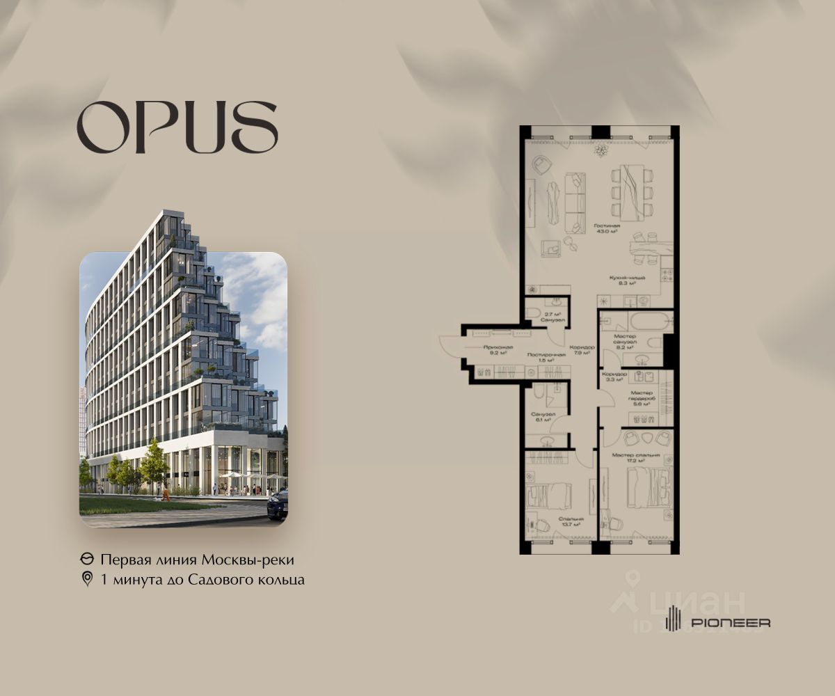 Прямая продажа от застройщика! Продаётся 2-к квартира общей площадью 126.7 кв. м. на 5-м этаже 11 этажного дома. Клубный дом OPUS - современный шедевр архитектуры от компании PIONEER, трансформирующий пространство, меняющий привычный ход вещей. Близость Москвы-реки определила его исключительную форму, вдохновлённую стихией воды. Уникальный и единственный в своём роде OPUS создаёт ощущение преображения, деликатно взаимодействуя с городской тканью. Продуманная территория с парковой атмосферой позволяет находиться в уединении в самом центре города, именно эти исключительные характеристики делают OPUS особенным. Площадь однокомнатной квартиры здесь превышает 50 квадратных метров, а отдельные трёхкомнатные решения восхищают 266-метровым простором и видами на реку.