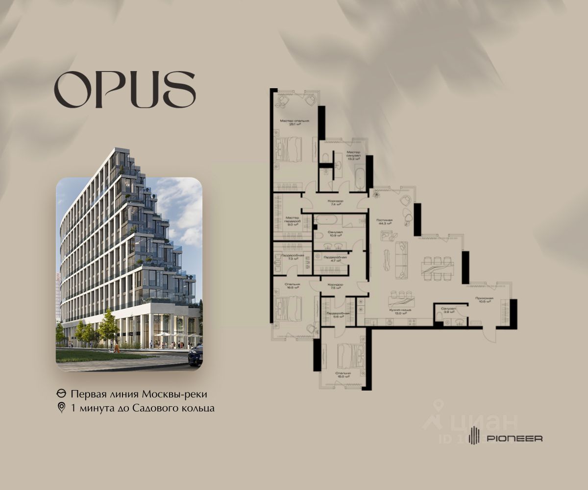 Прямая продажа от застройщика! Продаётся 3-к квартира общей площадью 193.9 кв. м. на 4-м этаже 11 этажного дома. Клубный дом OPUS - современный шедевр архитектуры от компании PIONEER, трансформирующий пространство, меняющий привычный ход вещей. Близость Москвы-реки определила его исключительную форму, вдохновлённую стихией воды. Уникальный и единственный в своём роде OPUS создаёт ощущение преображения, деликатно взаимодействуя с городской тканью. Продуманная территория с парковой атмосферой позволяет находиться в уединении в самом центре города, именно эти исключительные характеристики делают OPUS особенным. Площадь однокомнатной квартиры здесь превышает 50 квадратных метров, а отдельные трёхкомнатные решения восхищают 266-метровым простором и видами на реку. Уникальные квартиры с 8 балконами на разные стороны света, не менее эффектные решения - кабинеты и гардеробные с отдельными балконами, а ванные комнаты с панорамными окнами и собственным балконом. OPUS располагается в историческом месте с видом на Крутицкое подворье и Симоновский вал. Совсем рядом легендарное Замоскворечье - район, сохранивший камерную атмосферу старой Москвы. Локация уникальна также тем, что новые современные объекты будут соседствовать здесь с культовыми объектами культурного и исторического наследия города. За 22 года на рынке недвижимости компания PIONEER реализовала более 30 проектов. Сегодня PIONEER - девелопер премиальной недвижимости с 4 проектами класса премиум и deluxe. Продажа от застройщика. Покупка доступна в рассрочку и ипотеку. Звоните, и мы с удовольствием расскажем все подробности о проекте и условиях покупки.