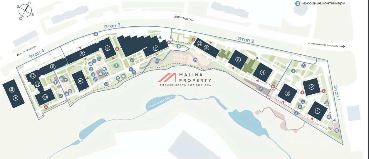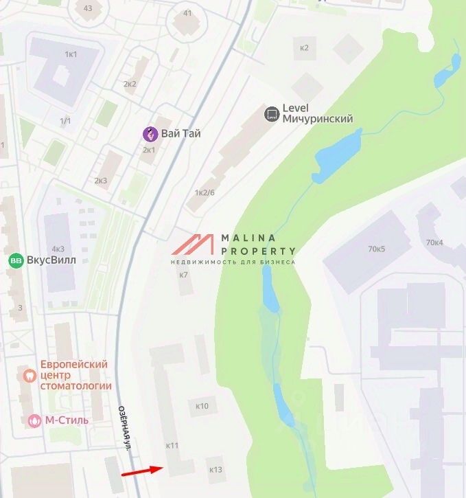 Помещение располагается в строящемся жилом комплексе бизнес класса ''Level Мичуринский''. Всего в комплексе будет 13 корпусов. 3807 квартир, 8316 жителей. Сдача данного дома 3 квартал 2027 года. В сданный корпусах первой очереди уже работает пункт выдачи ''Ozon'', строительный магазин, на ремонте аптека ''36 и 6''. Идет активное заселение.