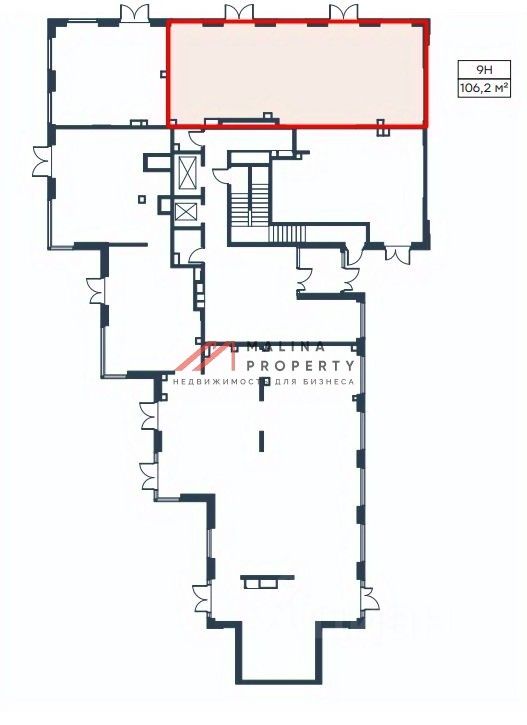 Помещение 106,2 м2 располагается на 1 этаже, открытая планировка, два отдельных входа, высота потолка 5 м, витринные окна по фасаду. Место для размещения рекламы.