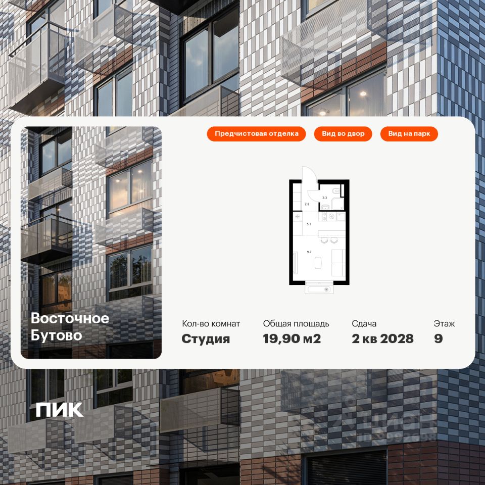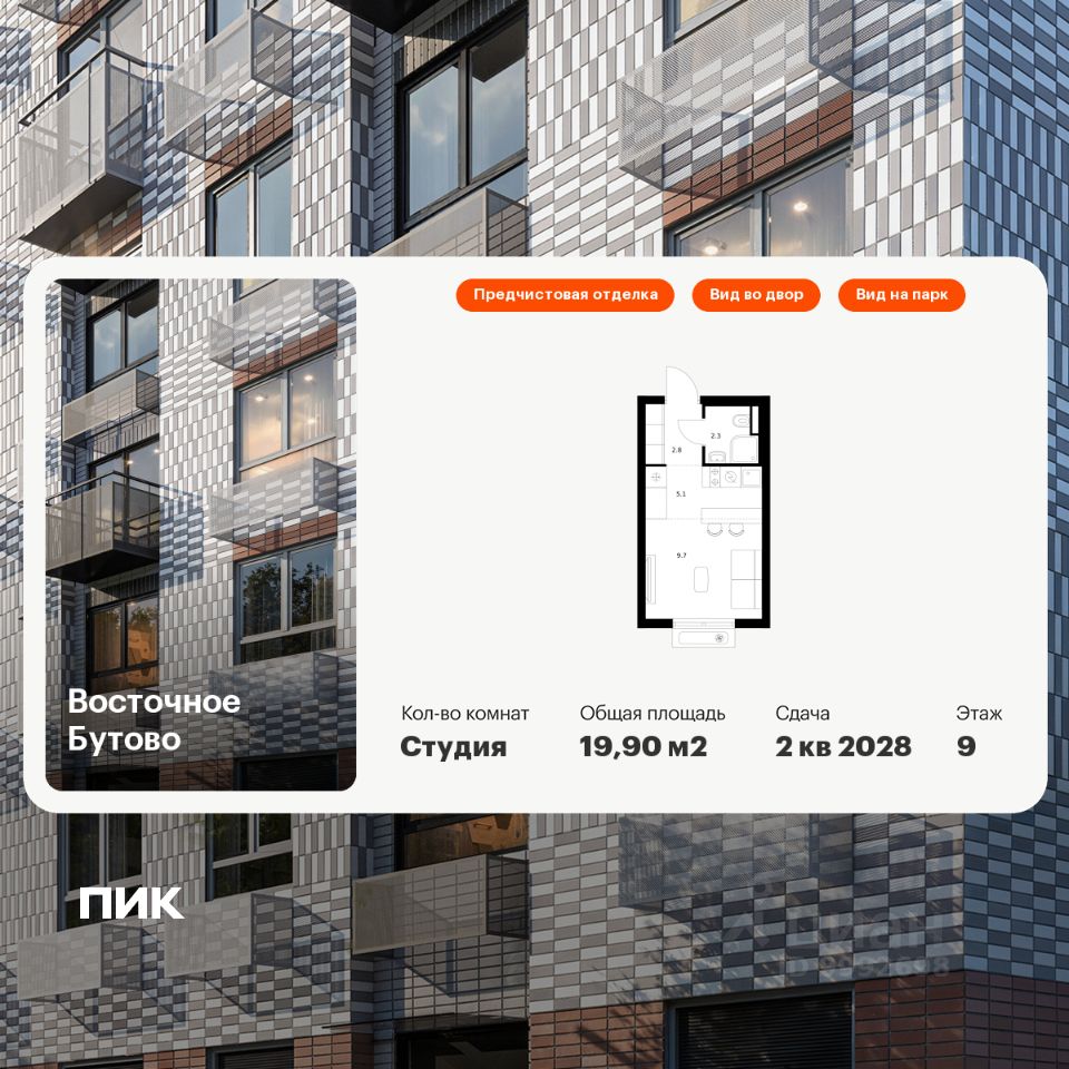 Продаётся квартира-студия площадью 19,9 кв.м на 9 этаже 17 этажного дома (Корпус 48, Секция 2) проекта ПИК Восточное Бутово. Светлый просторный подъезд на уровне земли, функциональная планировка, большие окна, предчистовая отделка.