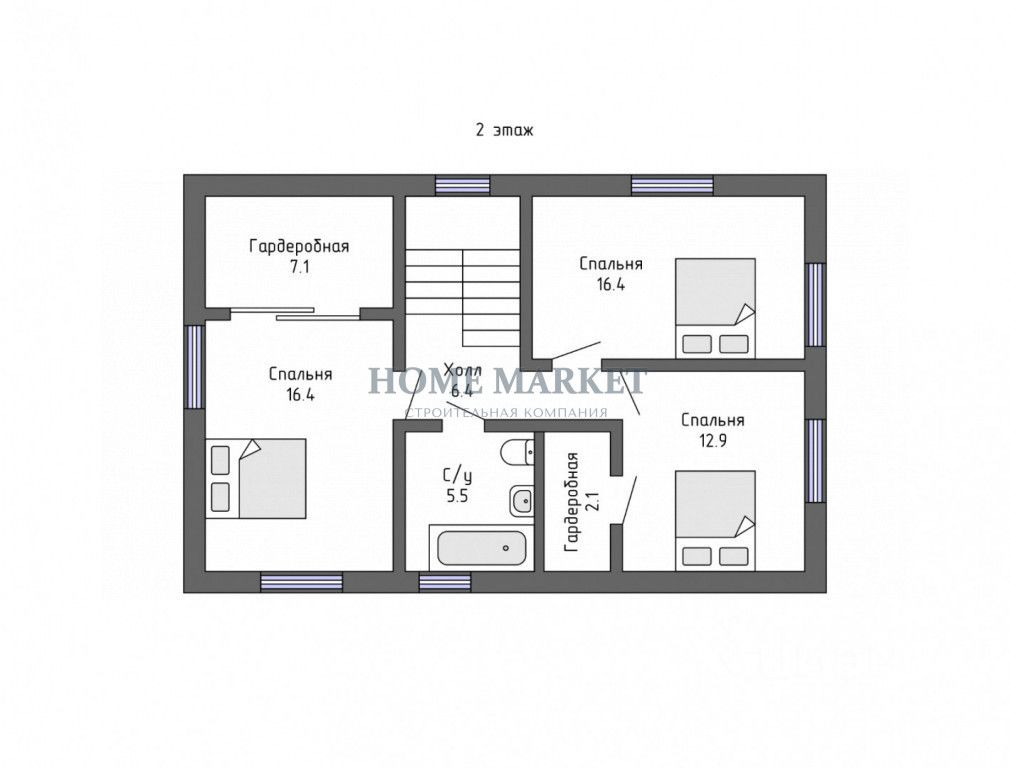 2 этаж: мастер-спальня с гардеробной, детская комната, спальня с гардеробной, ванная комната,